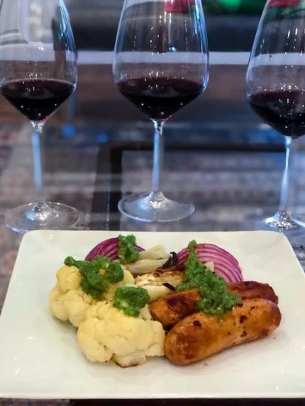 The recipe was Grilled Italian Sausages with Cauliflower, Fennel, Red Onion, and Basil Gremolada, which they told us was a favorite of Julie Pedroncelli’s, who often is the creator of these recipes. The link to the recipe is here. You’d think this would be a tough pairing, but they all worked. Because the recipes were guidelines and I’m allergic to pork, we substituted chicken sausage.