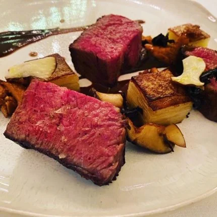 A Bar n Ranch Wagyu Short Rib with Black Trumpet Mushrooms, Potato Terrine & Black Garlic Jus