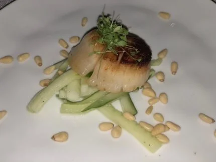 We moved to our Second Course, which was 2016 Sunset Hills Vineyard Viognier, Loudoun, Virginia, with Seared Diver Scallop with Cucumber, Calamansi, Paw Paw Vinaigrette and Pine Nuts.